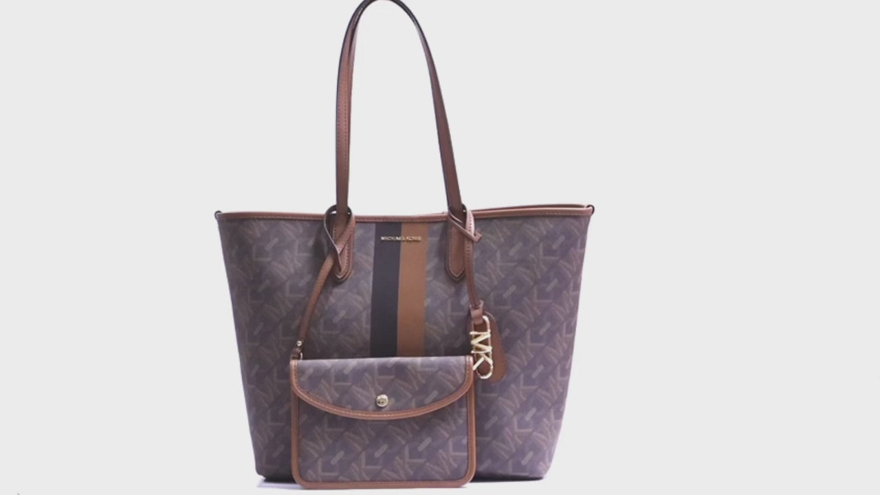 جلد العجل الغني وطباعة المونوغرام: استمتع بالمزيج المتطور من جلد العجل المزخرف ونمط المونوغرام المميز لمايكل كورس بألوان متعددة البني والأسود والجملي.