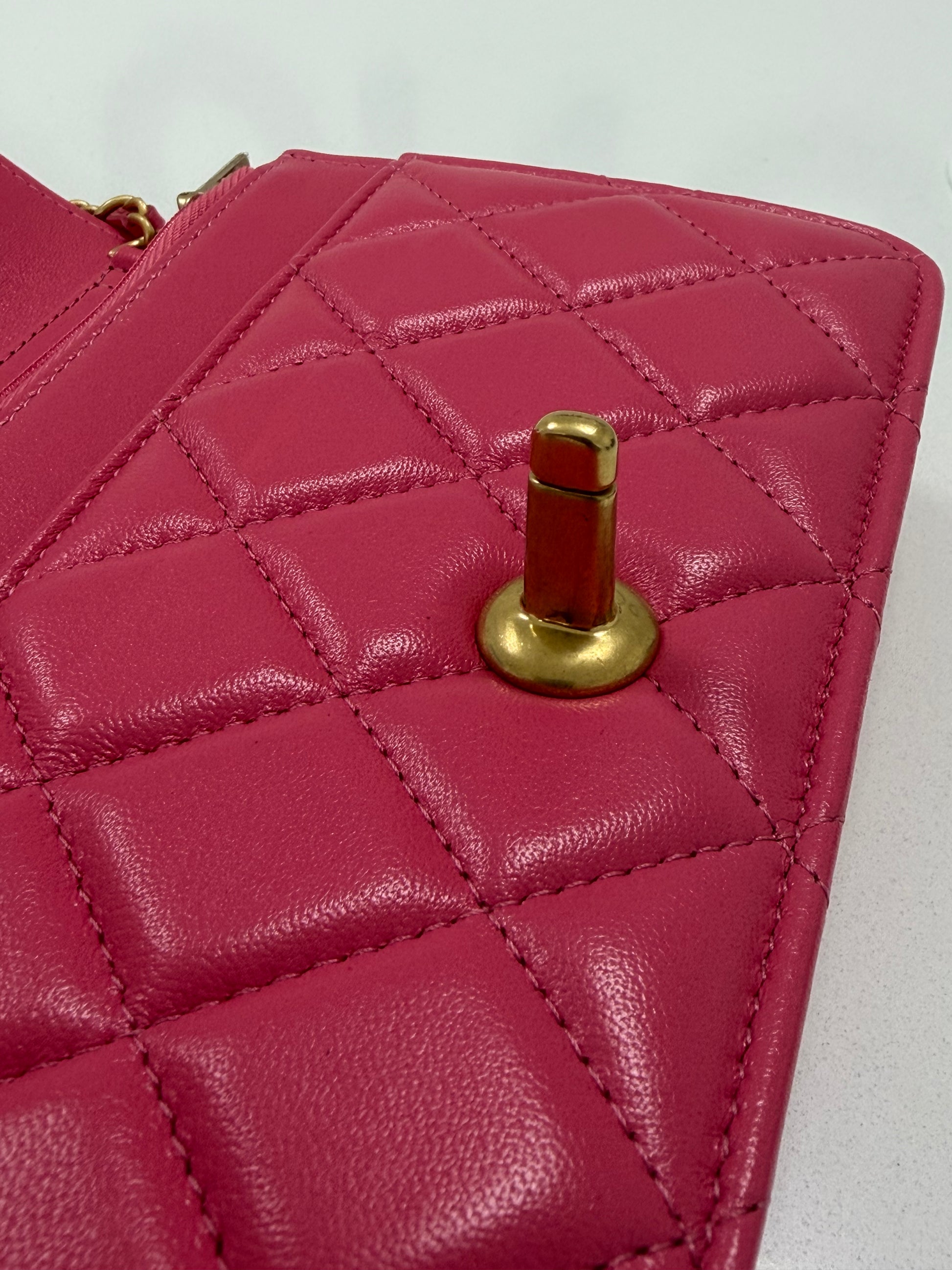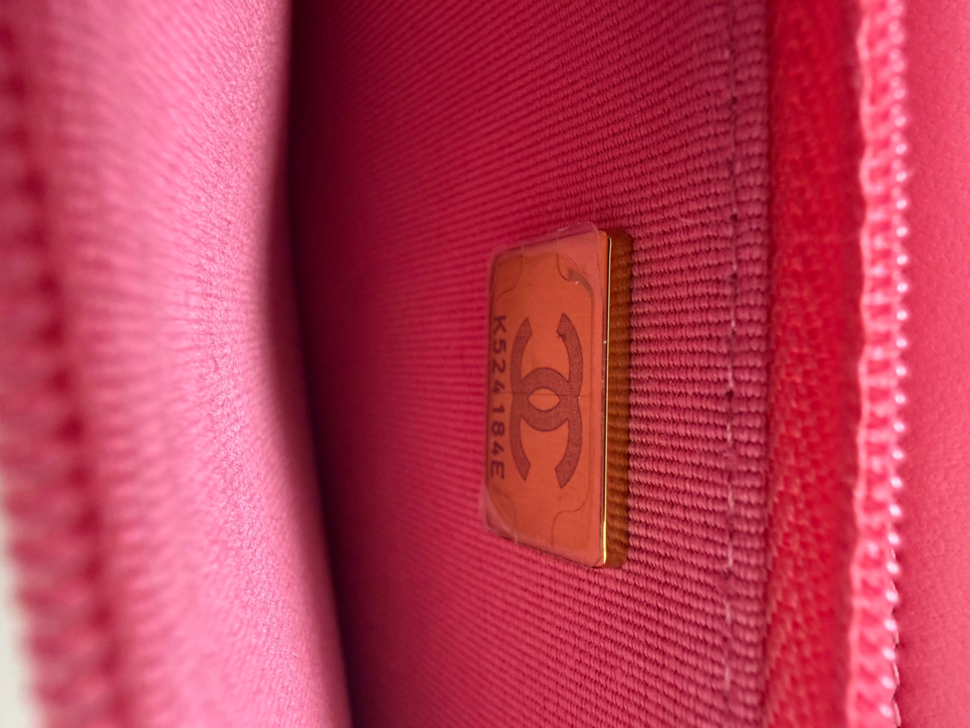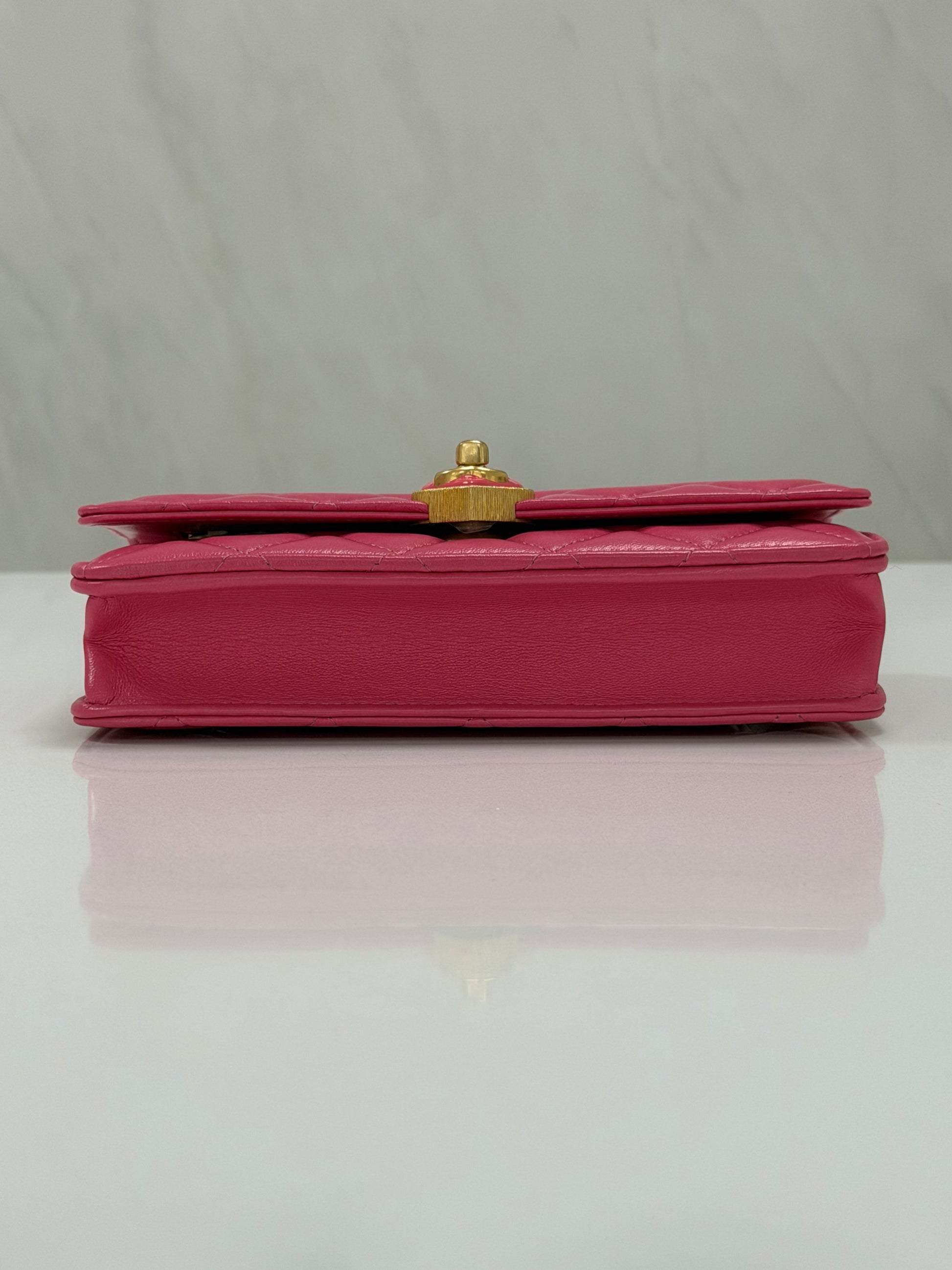 • Pink Quilted Lambskin Leather: Crafted from soft pink lambskin with signature quilting, offering a luxurious and stylish appearance.