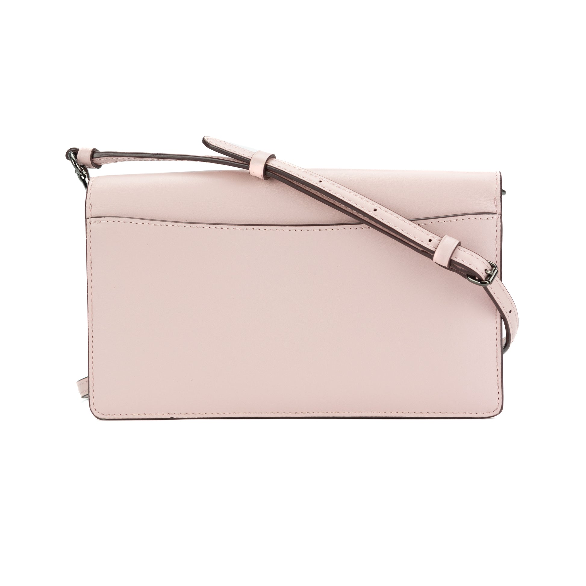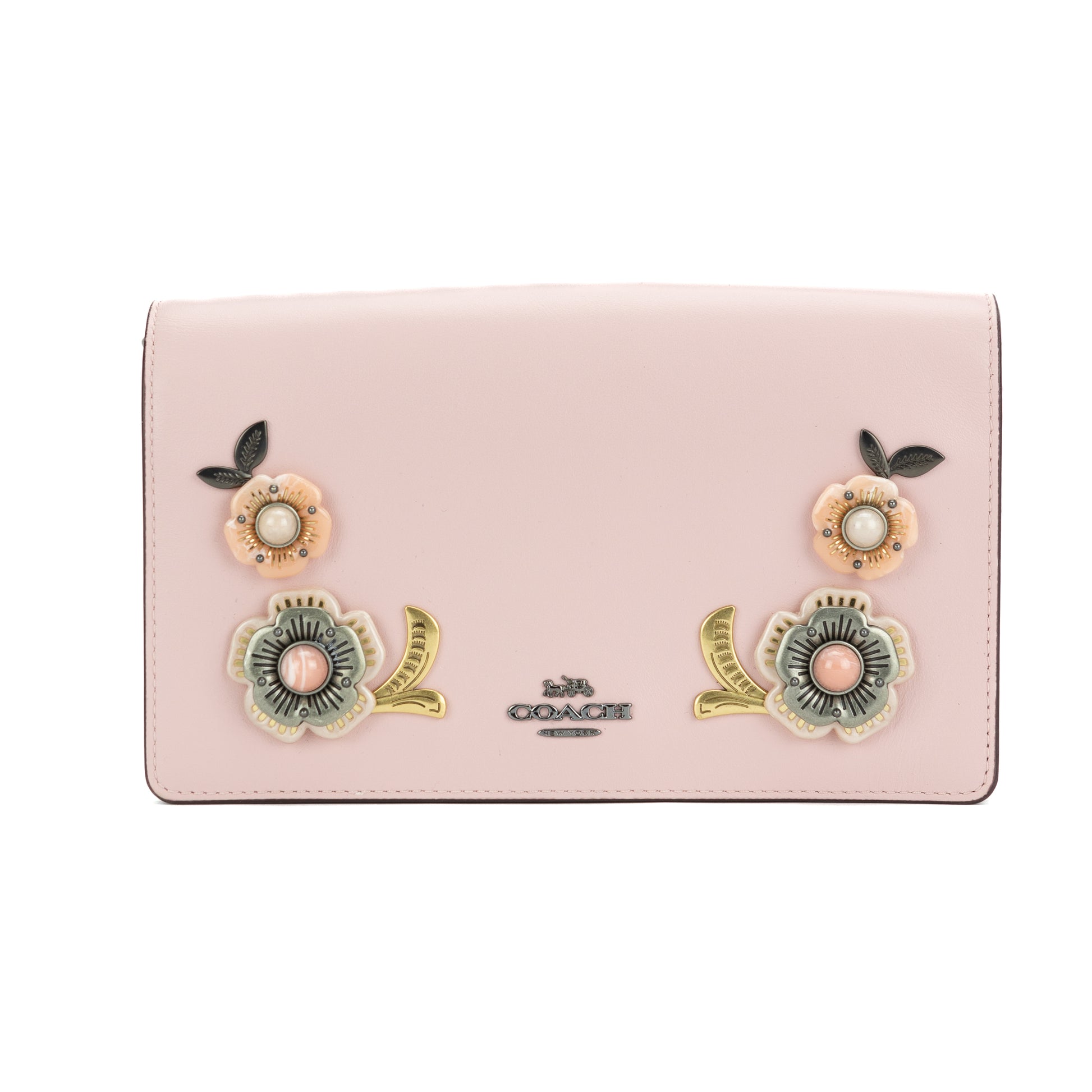 Embrace feminine charm and elegance with the Coach Hayden Foldover Crossbody Clutch in a soft pink hue, adorned with delicate tea rose stones. This versatile and compact clutch is crafted from refined calf leather, offering a luxurious feel and timeless appeal. Its practical design and multiple compartments make it the perfect companion for both day and night.