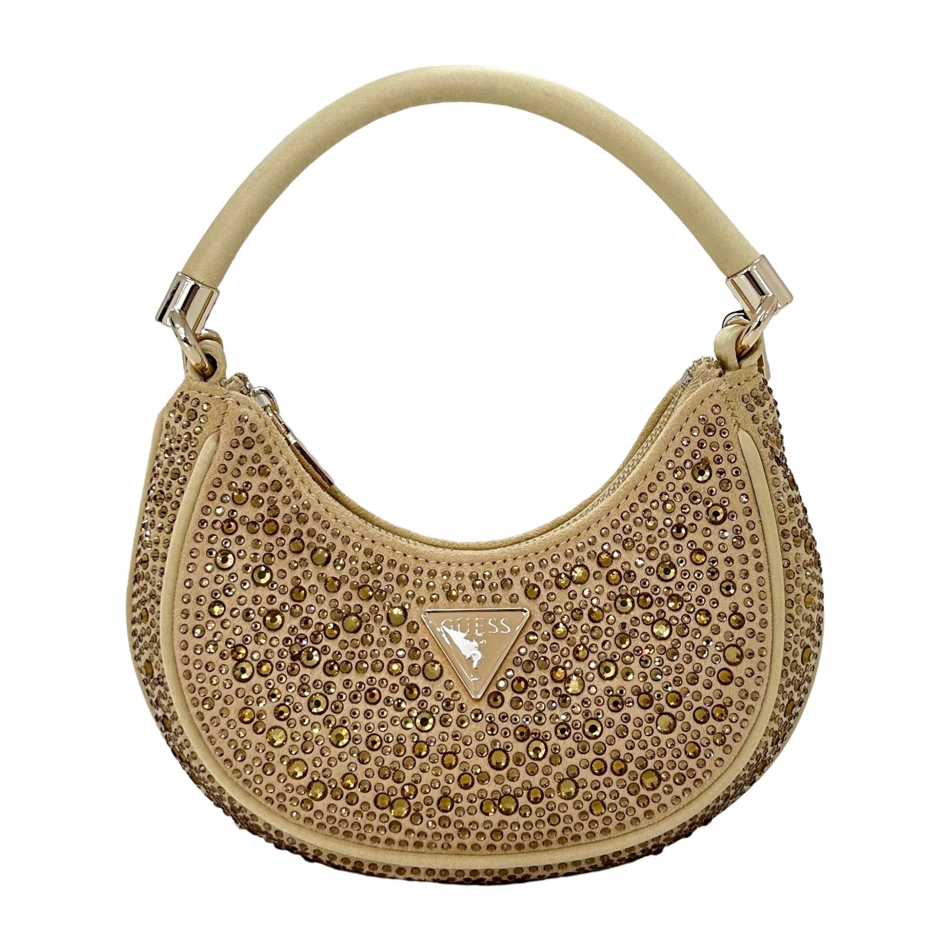 Shimmer with style using the Guess Zalina Mini Crossbody in Gold. This microfiber hobo bag adorned with rhinestones combines glamorous details with everyday practicality, perfect for adding sparkle to any outfit.