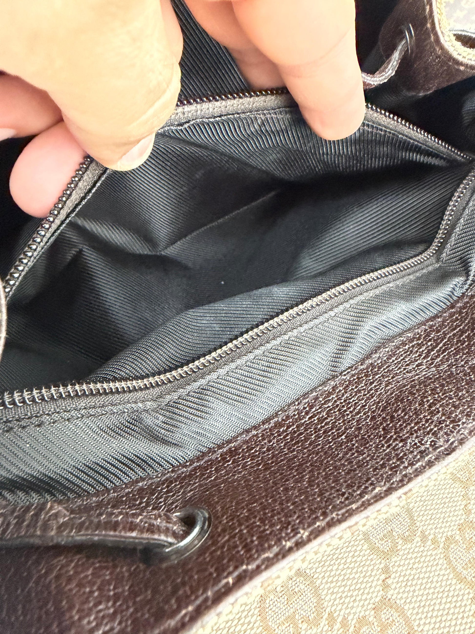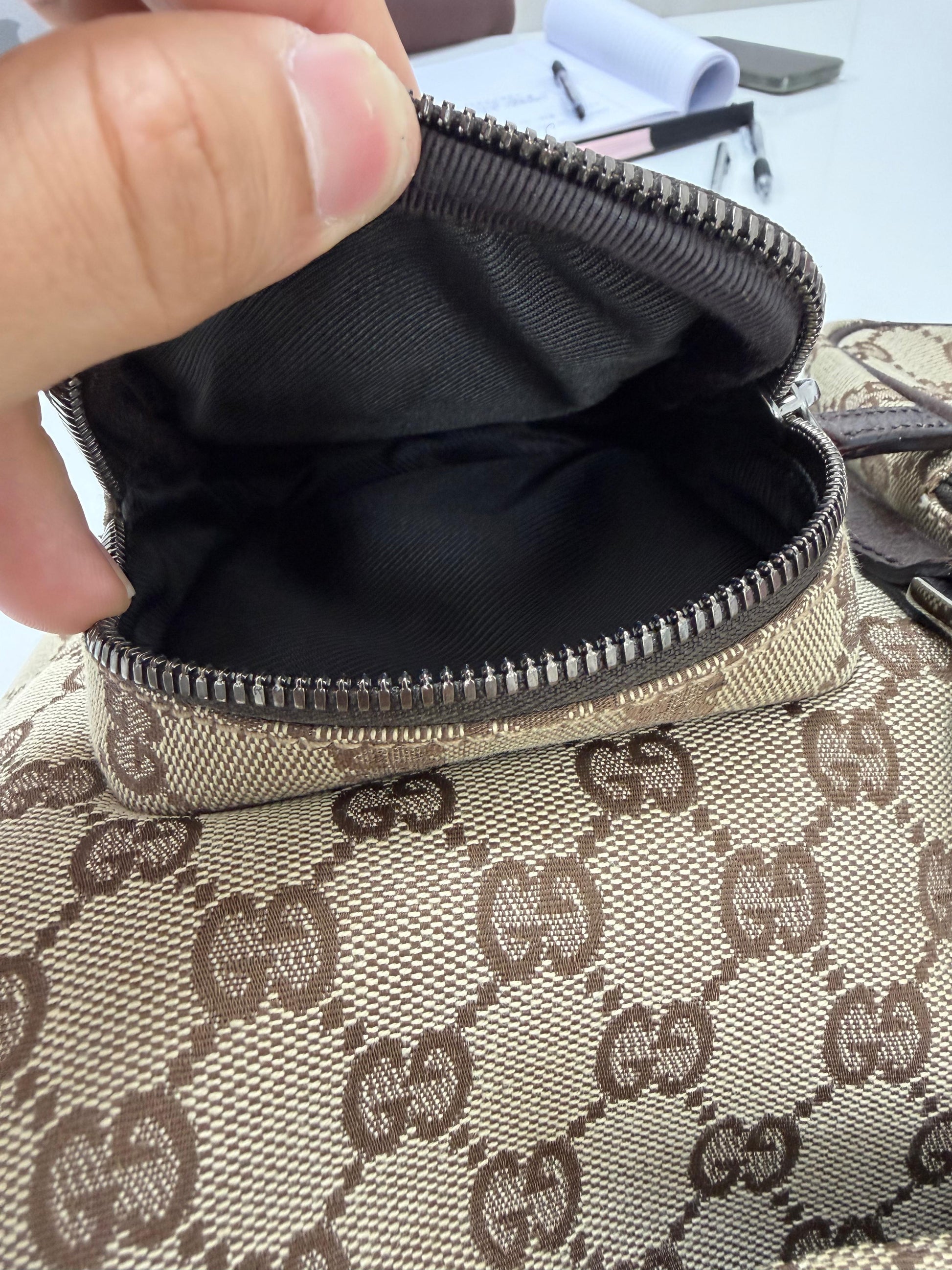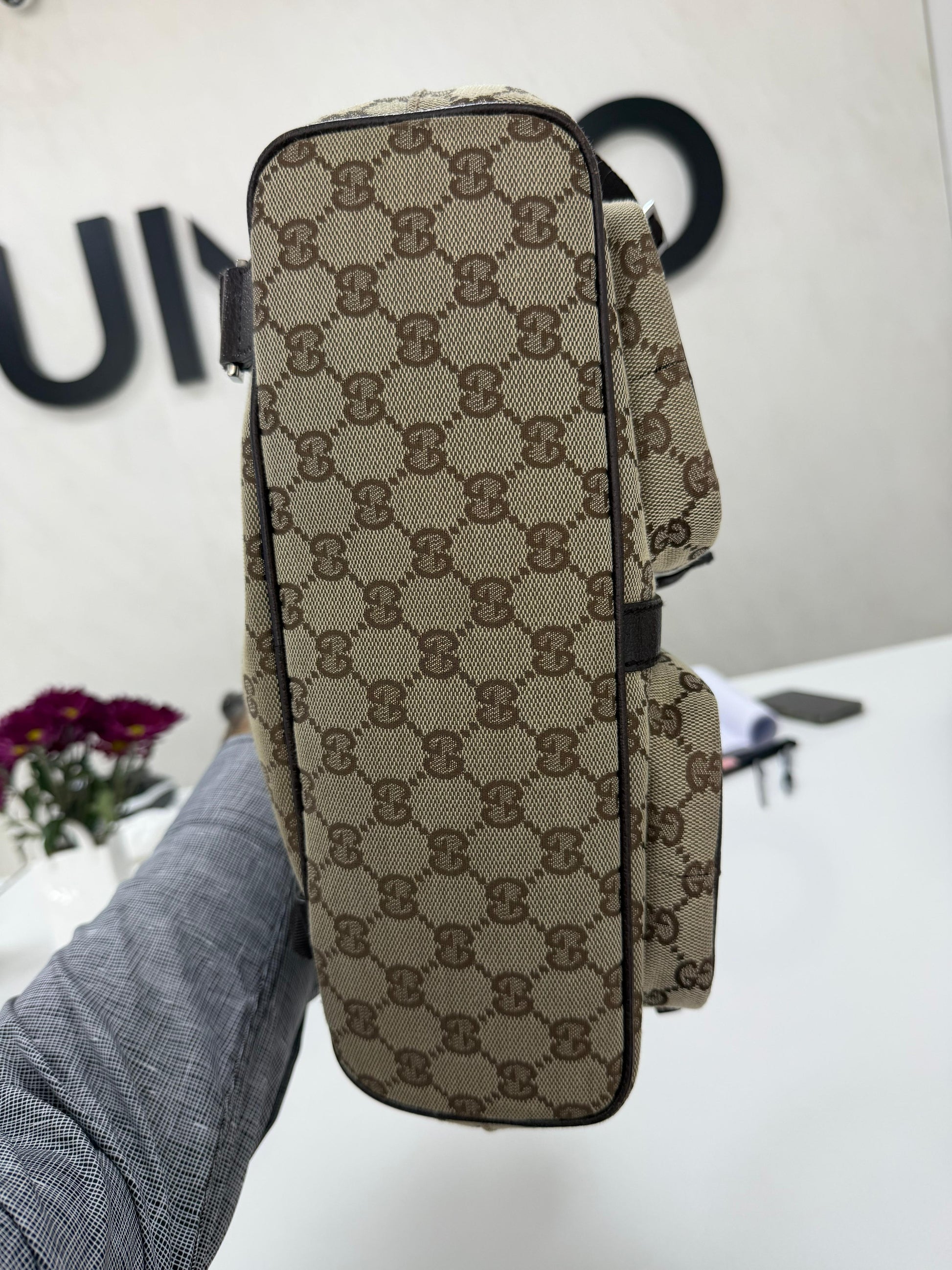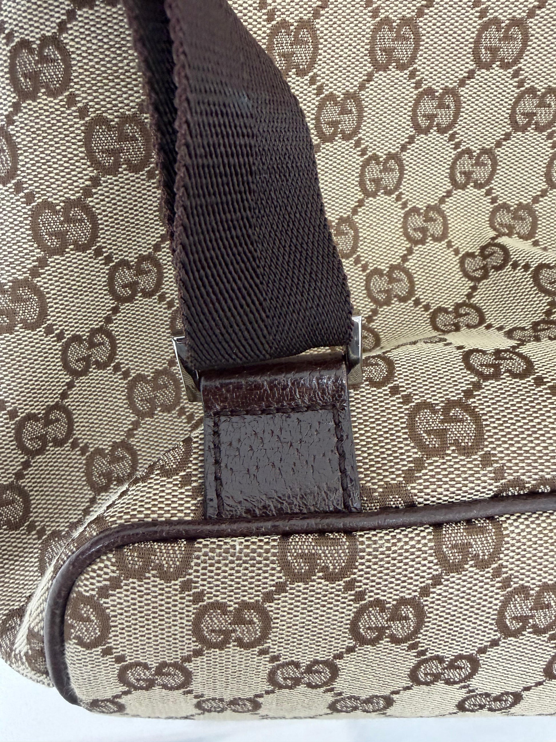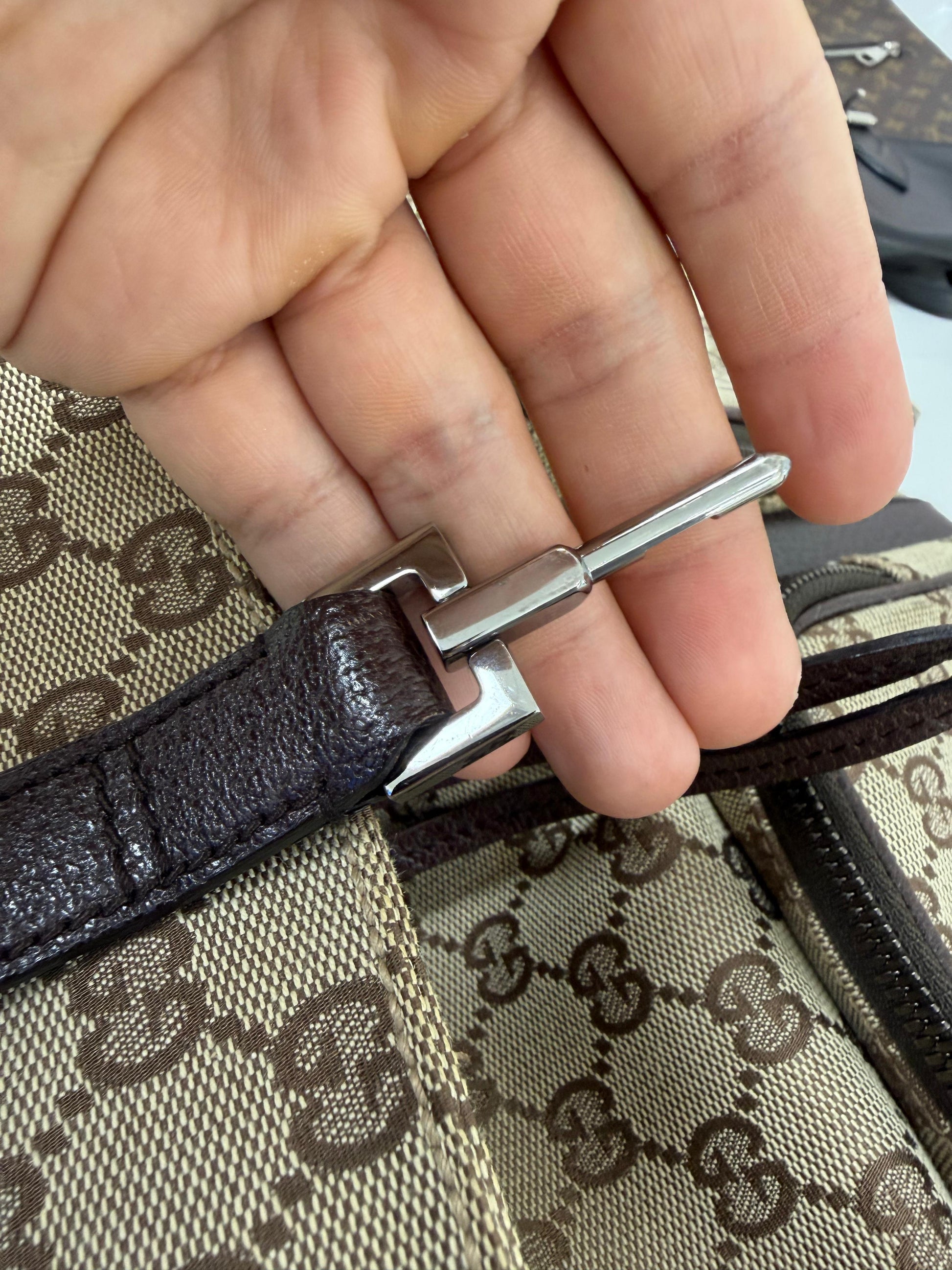 Signature GG Embossed Canvas: Crafted from brown and tan canvas embossed with the iconic GG logo throughout, offering a bold and unmistakable Gucci aesthetic.