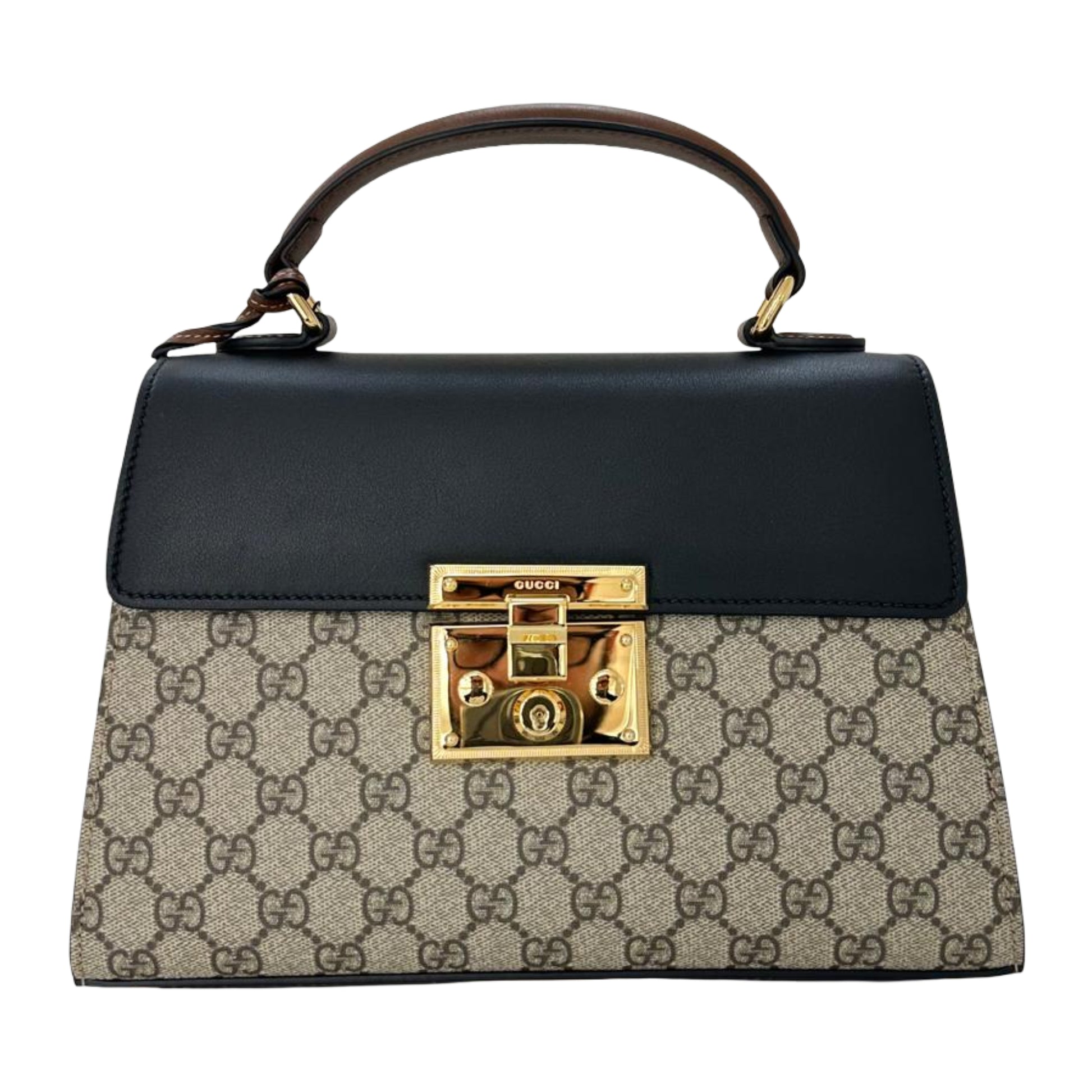 Gucci Top Handle Crossbody Handbag with Gold Lock Latch – Beige/Black/Brown