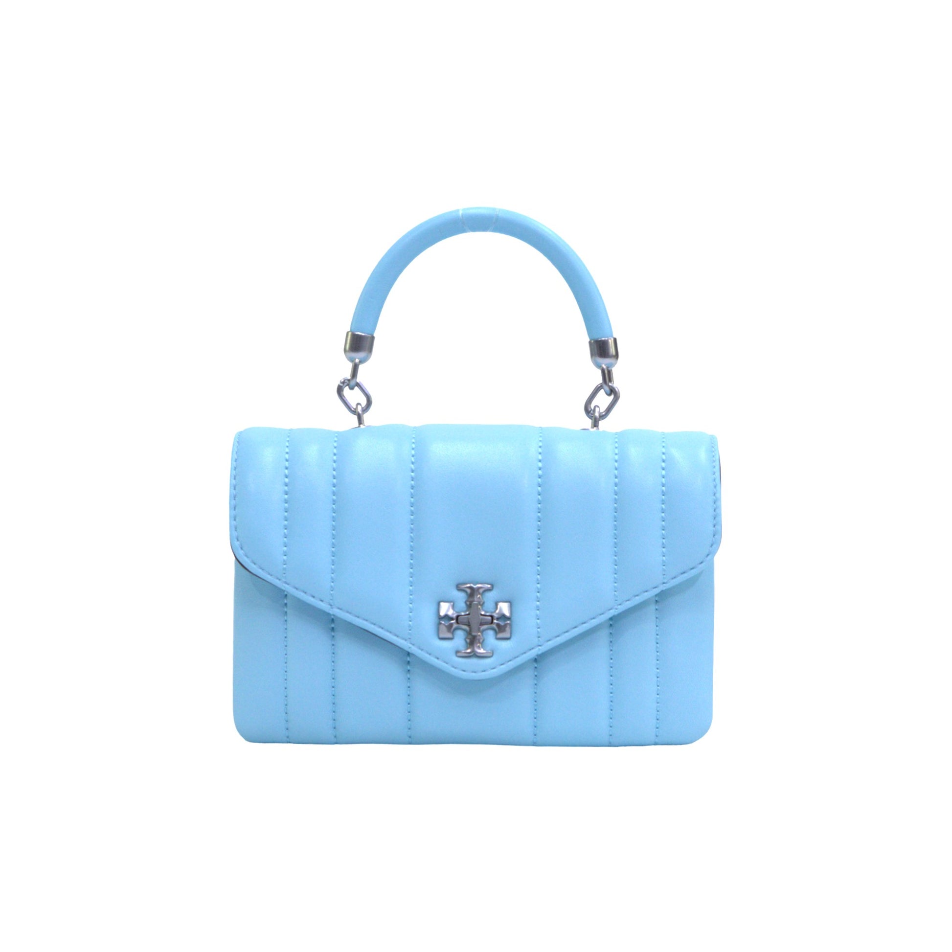 The Tory Burch Kira Mini Bag in Light Celeste is a chic and versatile choice that complements both casual and formal looks with effortless charm.