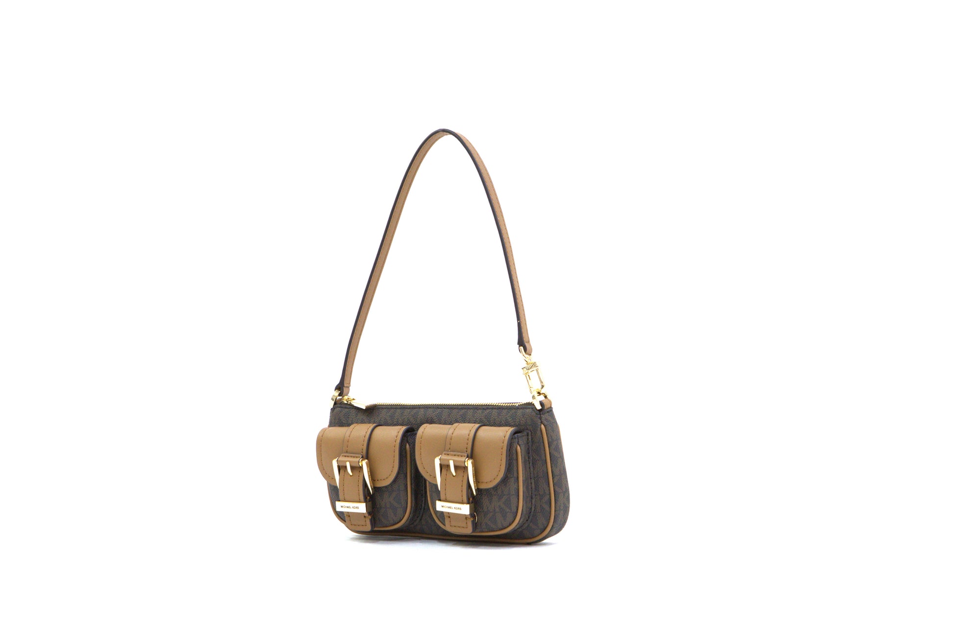 Chic, compact, and versatile, the Michael Kors Zoe Small Convertible Pouchette in Brown/Acorn is the perfect accessory for streamlined style. Crafted from signature logo-print canvas with elegant gold-tone hardware, this petite shoulder bag delivers both fashion and function in one stylish package. Ideal for day-to-night transitions, it features thoughtful design elements that enhance its practicality without compromising on luxury.