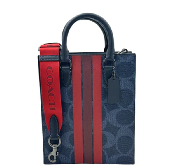 Sporty meets sophisticated in the Dylan Tote Bag In Signature Canvas With Varsity Stripe. With its compact design, premium materials, and bold navy tones, this tote brings effortless style and everyday functionality together in one striking accessory.