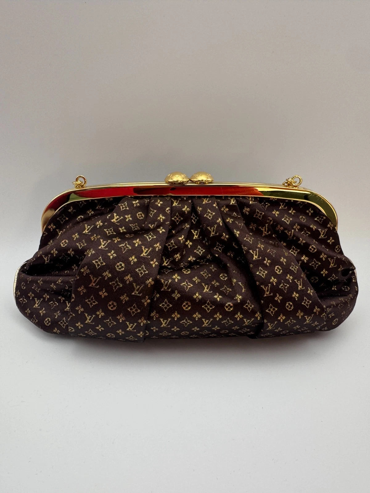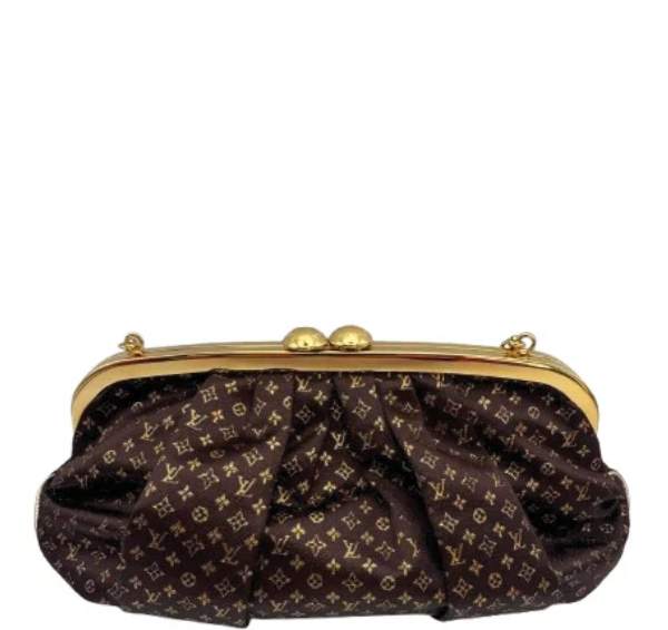 Louis Vuitton Monogram Satin Kiss Lock Clutch Evening Bag Brown Gold