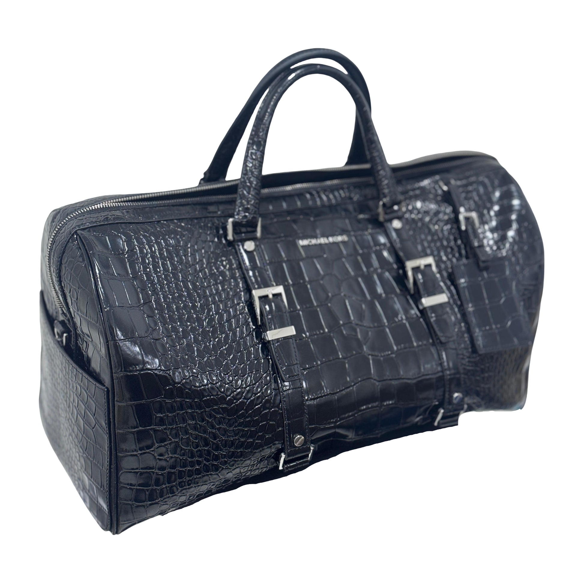 Travel in style with the Michael Kors Bedford Travel Extra Large Embossed Duffle Bag Weekender in Black. Crafted from luxurious metallic crocodile-embossed leather, this duffle combines elegance and practicality for your weekend getaways.
