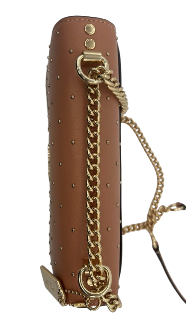 Polished gold-tone accents enhance the soft peach leather, adding a refined and feminine touch.
