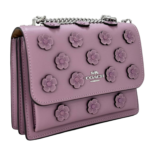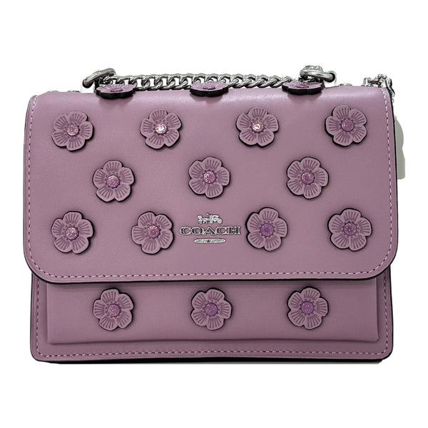 The Coach Mini Klare Crossbody Bag with Floral Appliqué - Silver/Lilac is a beautifully detailed piece that blends soft elegance with everyday practicality—ideal for adding a touch of floral flair to your wardrobe.