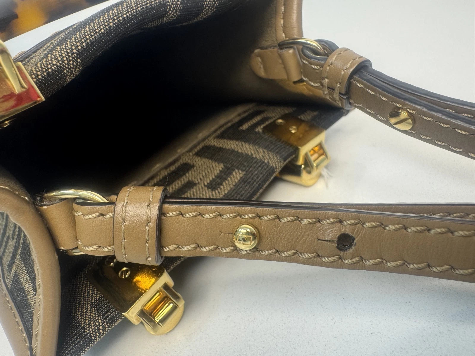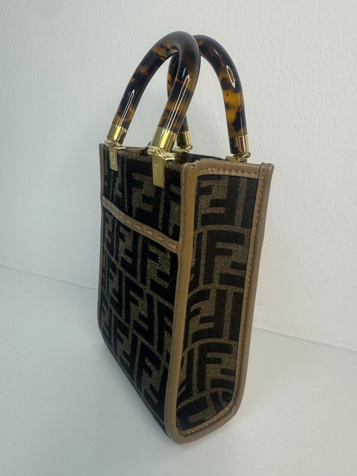This Fendi mini shopping tote is crafted from the iconic Zucca canvas, trimmed with smooth calfskin leather and finished with gold-tone hardware. The structured silhouette features a distinctive tortoiseshell-effect top handle with engraved FF logo hardware, along with a removable shoulder strap for versatile wear. An open-top design reveals a suede-lined interior with a single main compartment, making it a stylish yet functional mini bag ideal for day-to-night use.