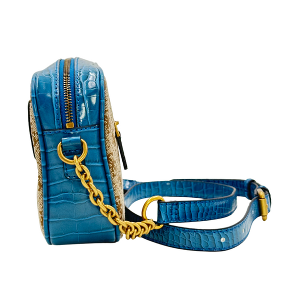 Compact and Stylish Design: The GUESS Aviana Camera Bag features sleek fabric paneling with the Quattro G logo pattern, faux-leather accents, and trim, creating a compact and stylish design.