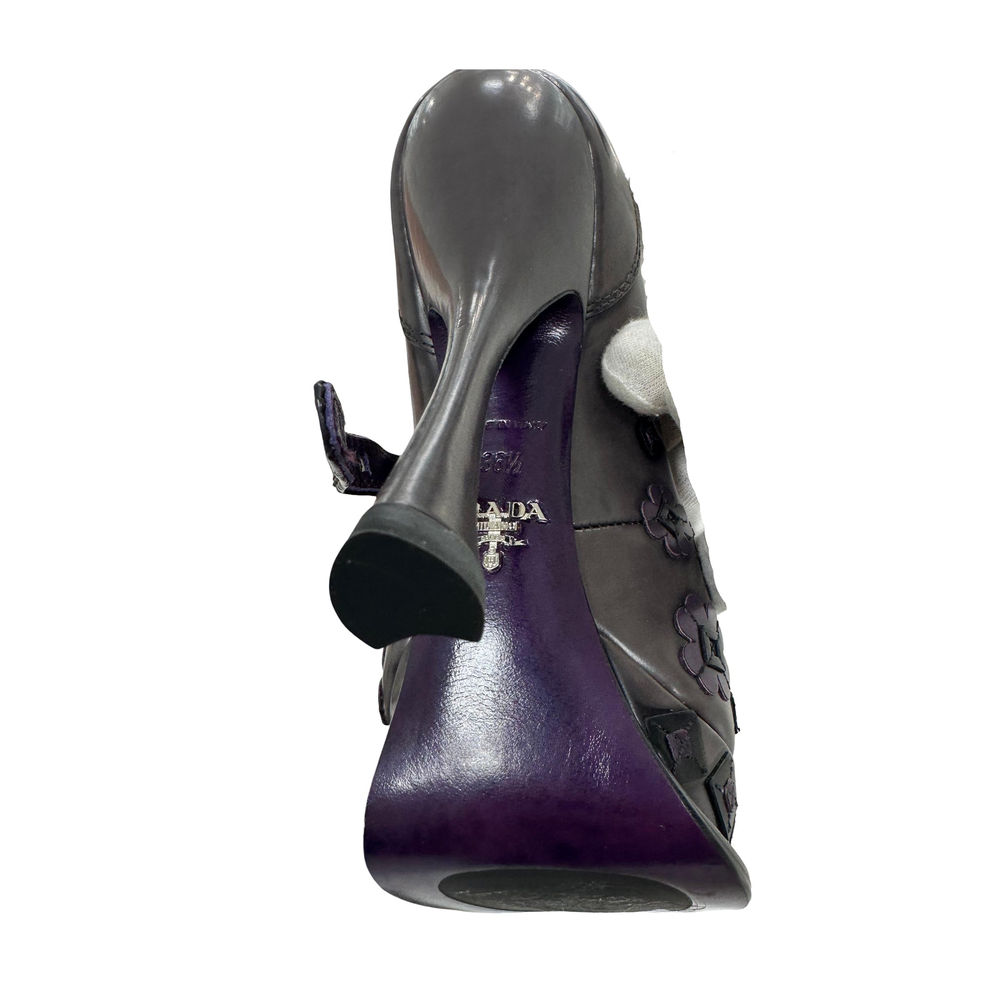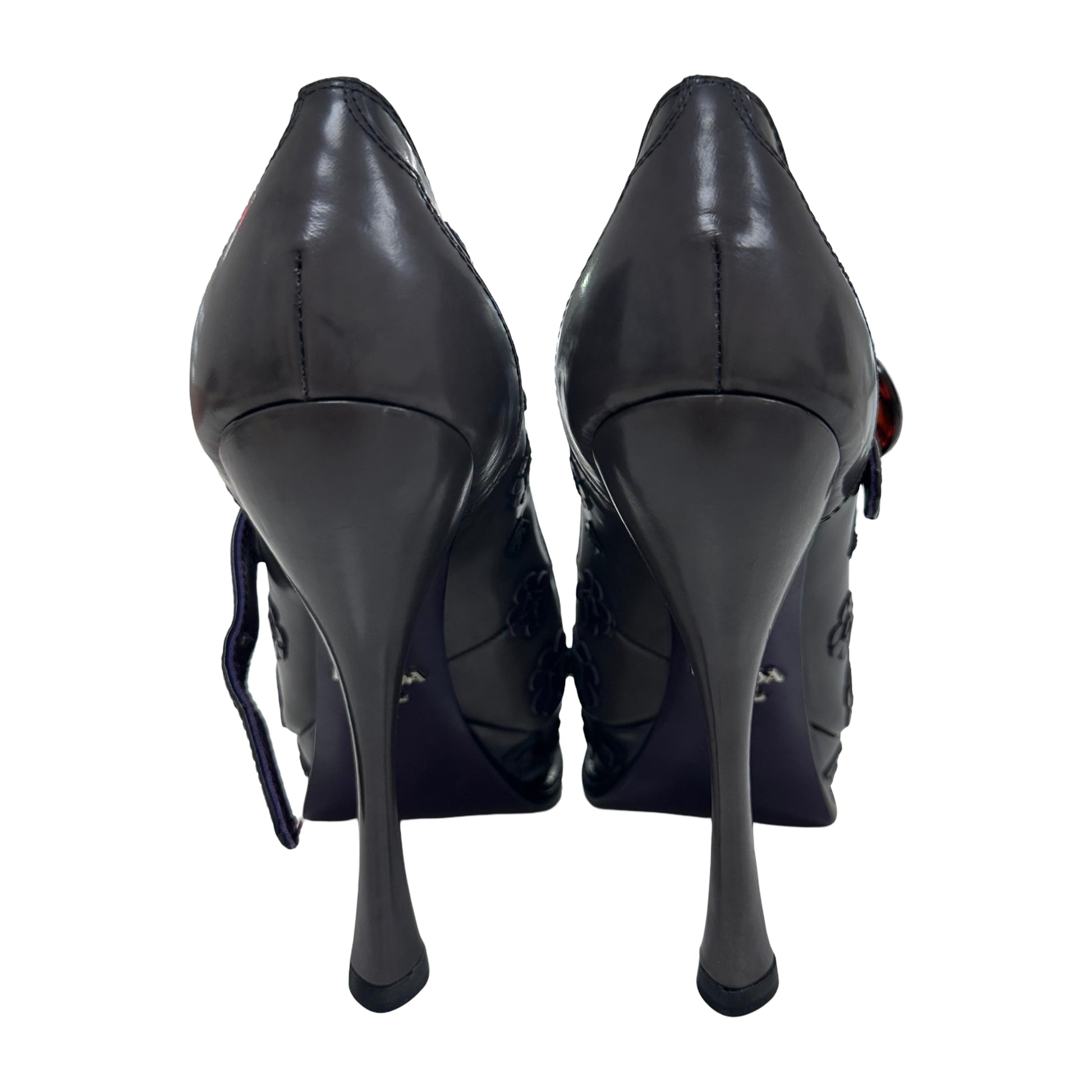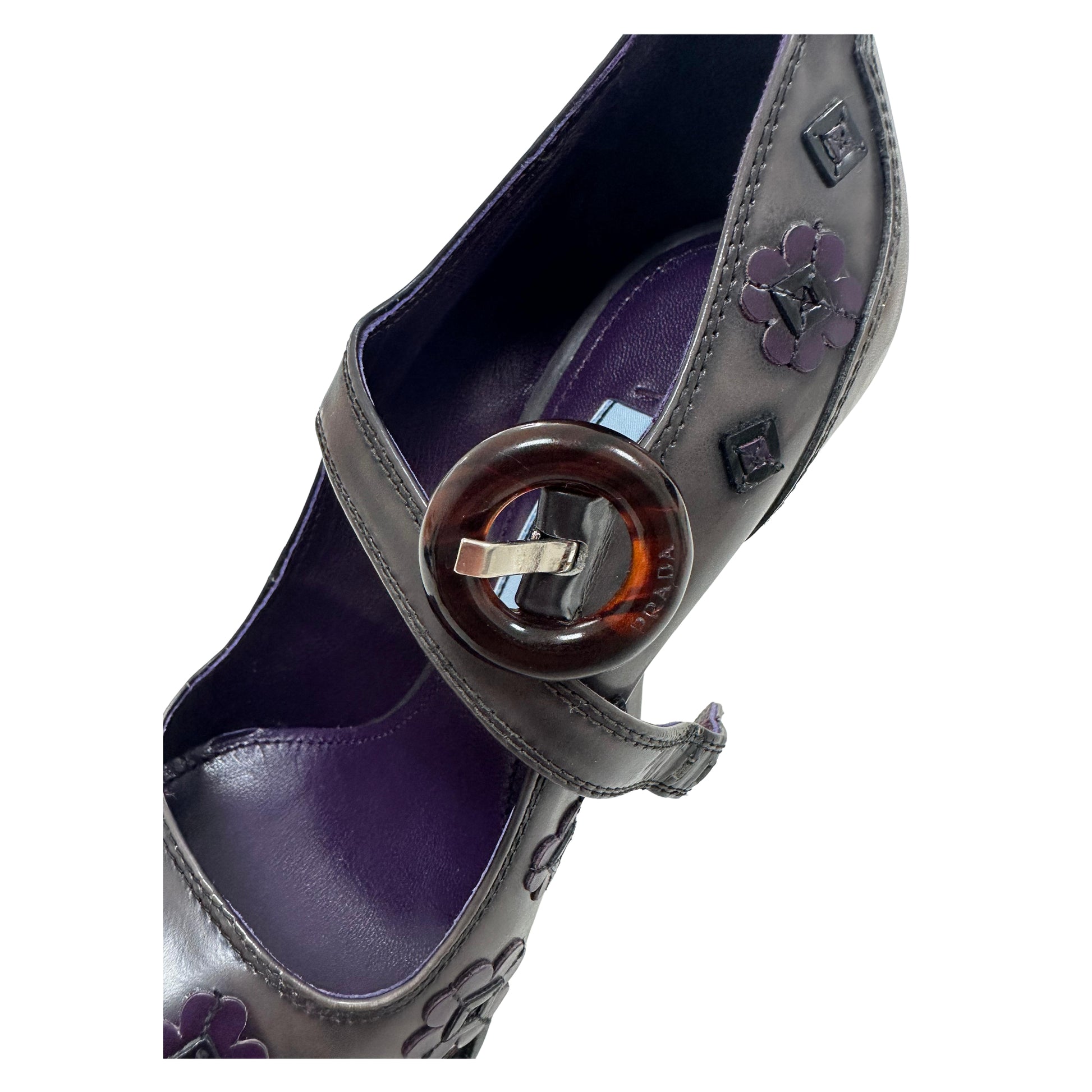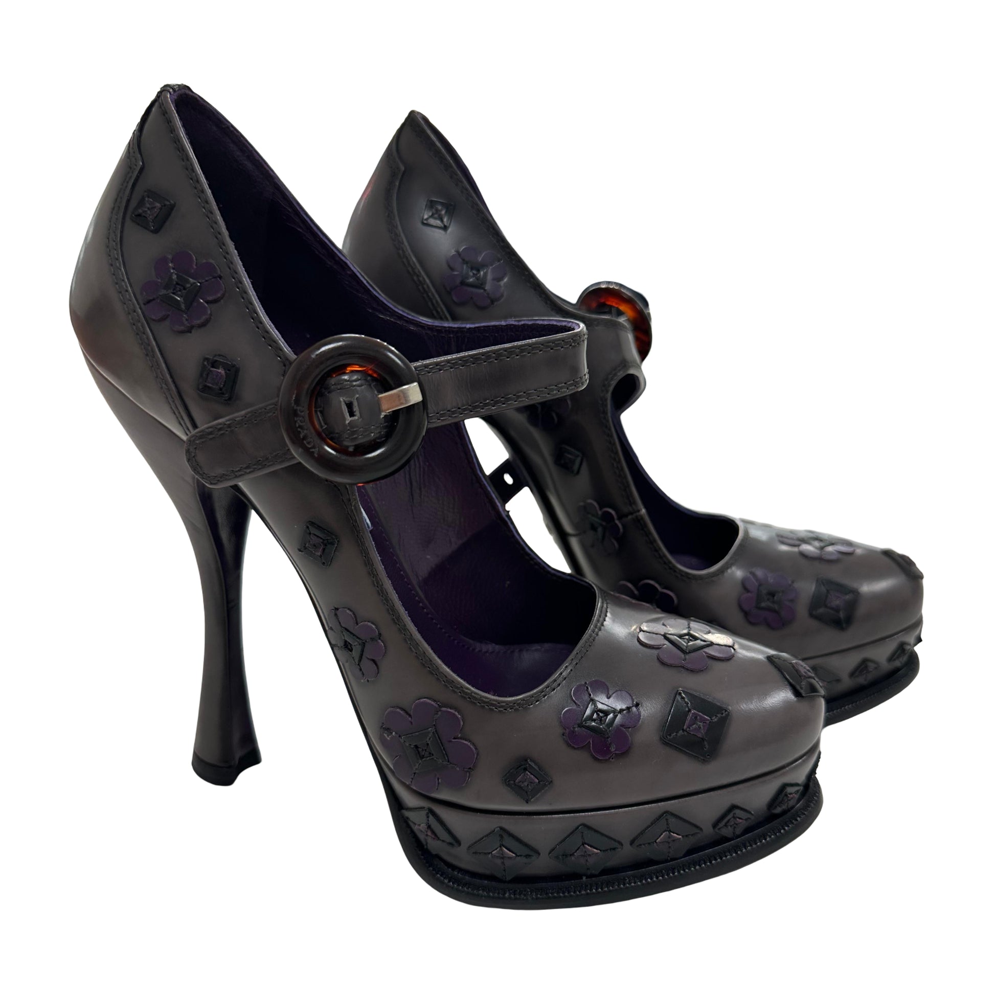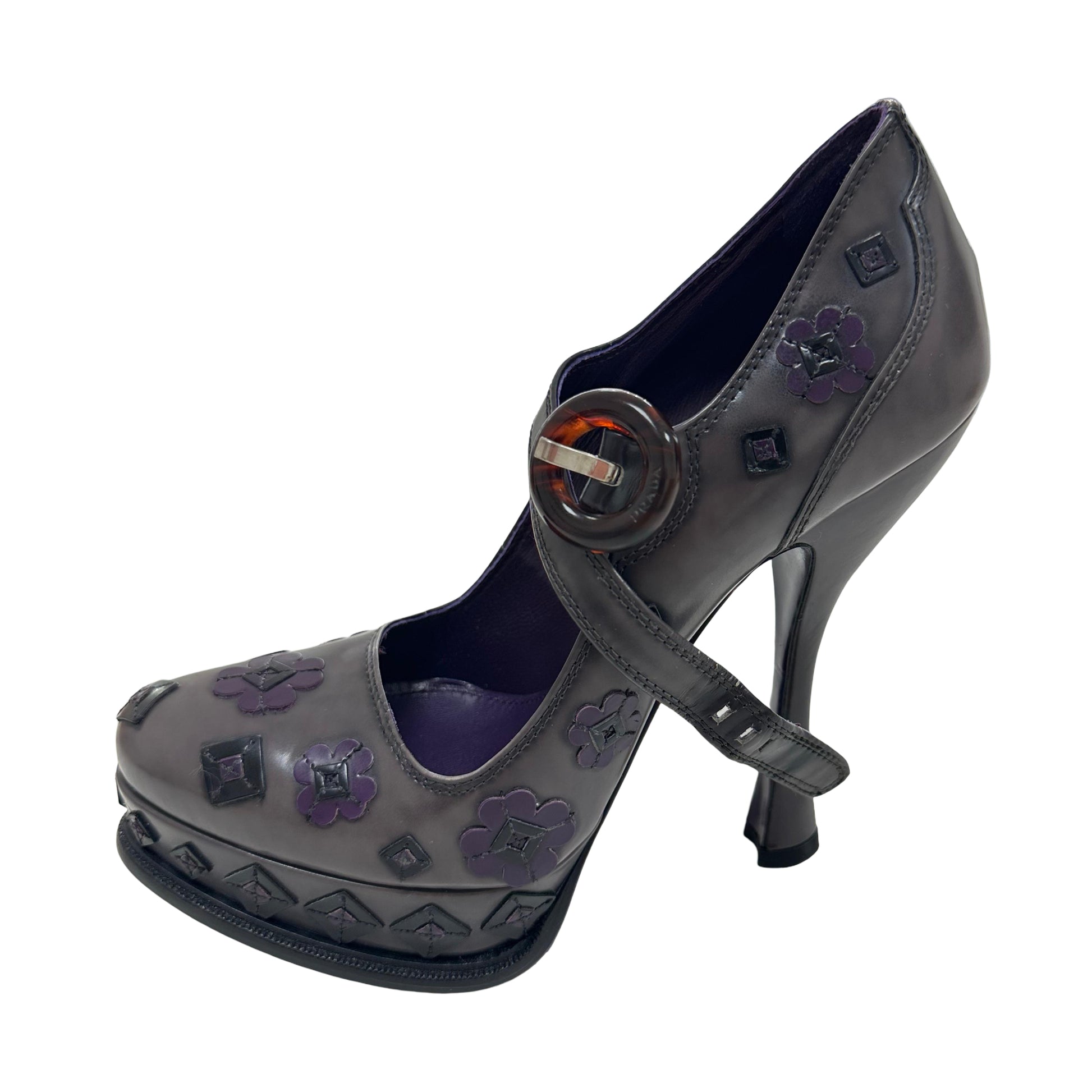 The Prada Mary Jane Spazzolato Flower Platform Pumps in Violet combine dramatic height, playful detailing, and classic Italian craftsmanship — a true statement piece for the fashion enthusiast.