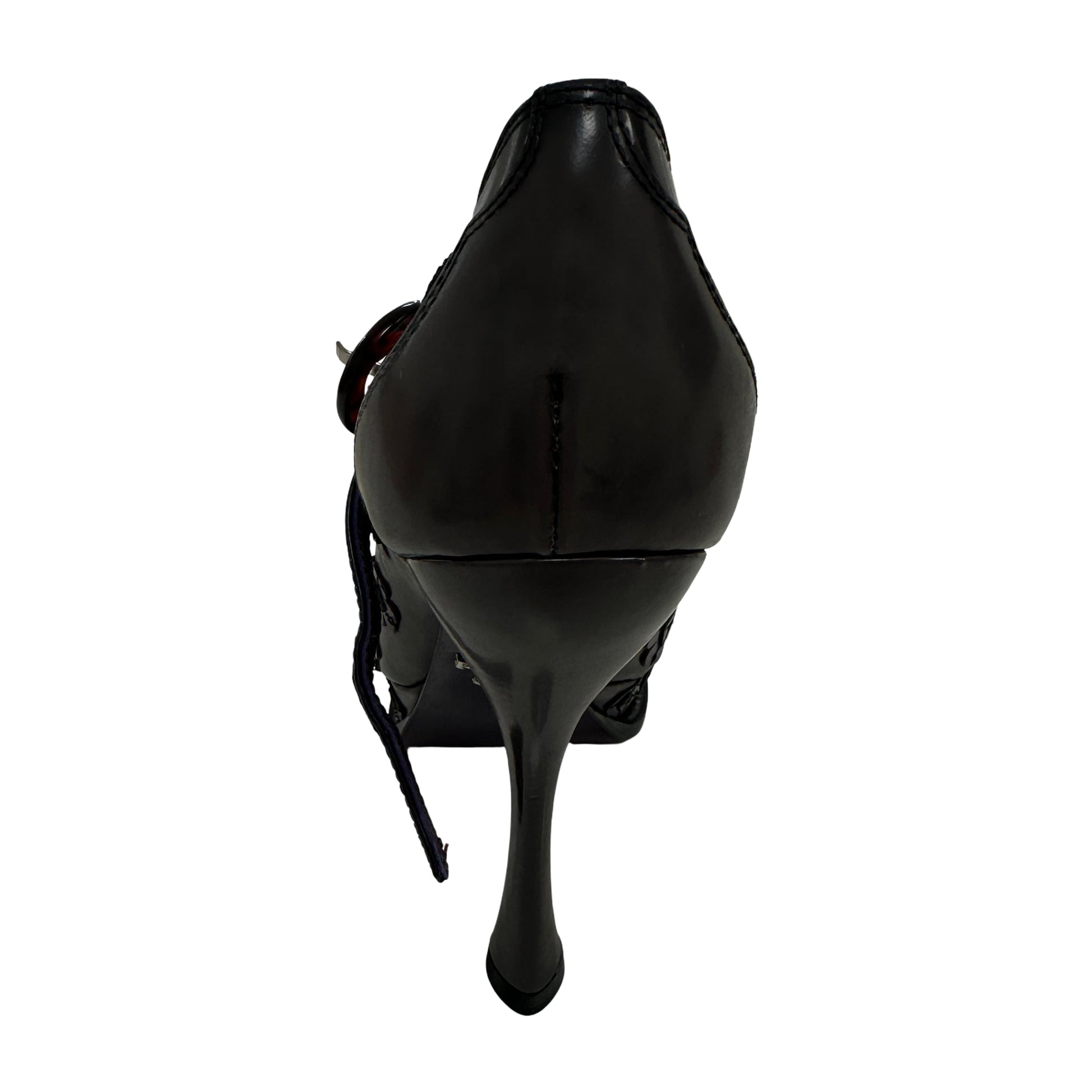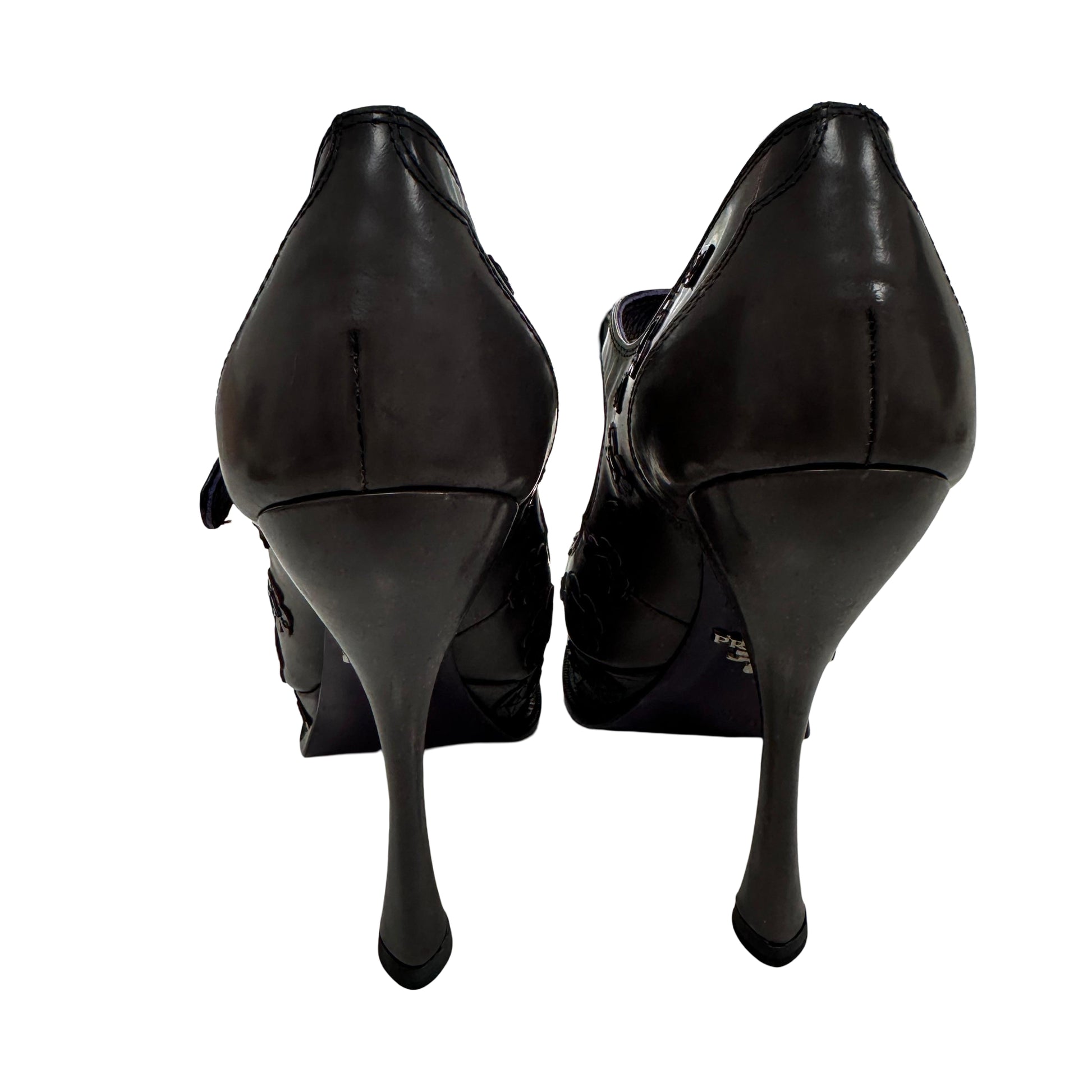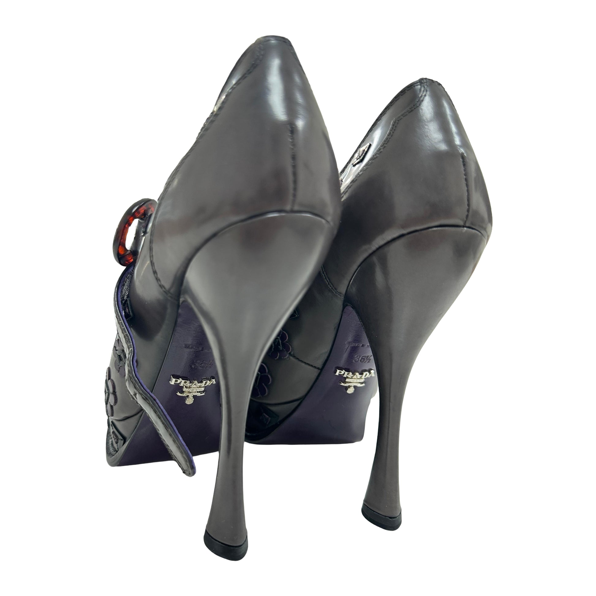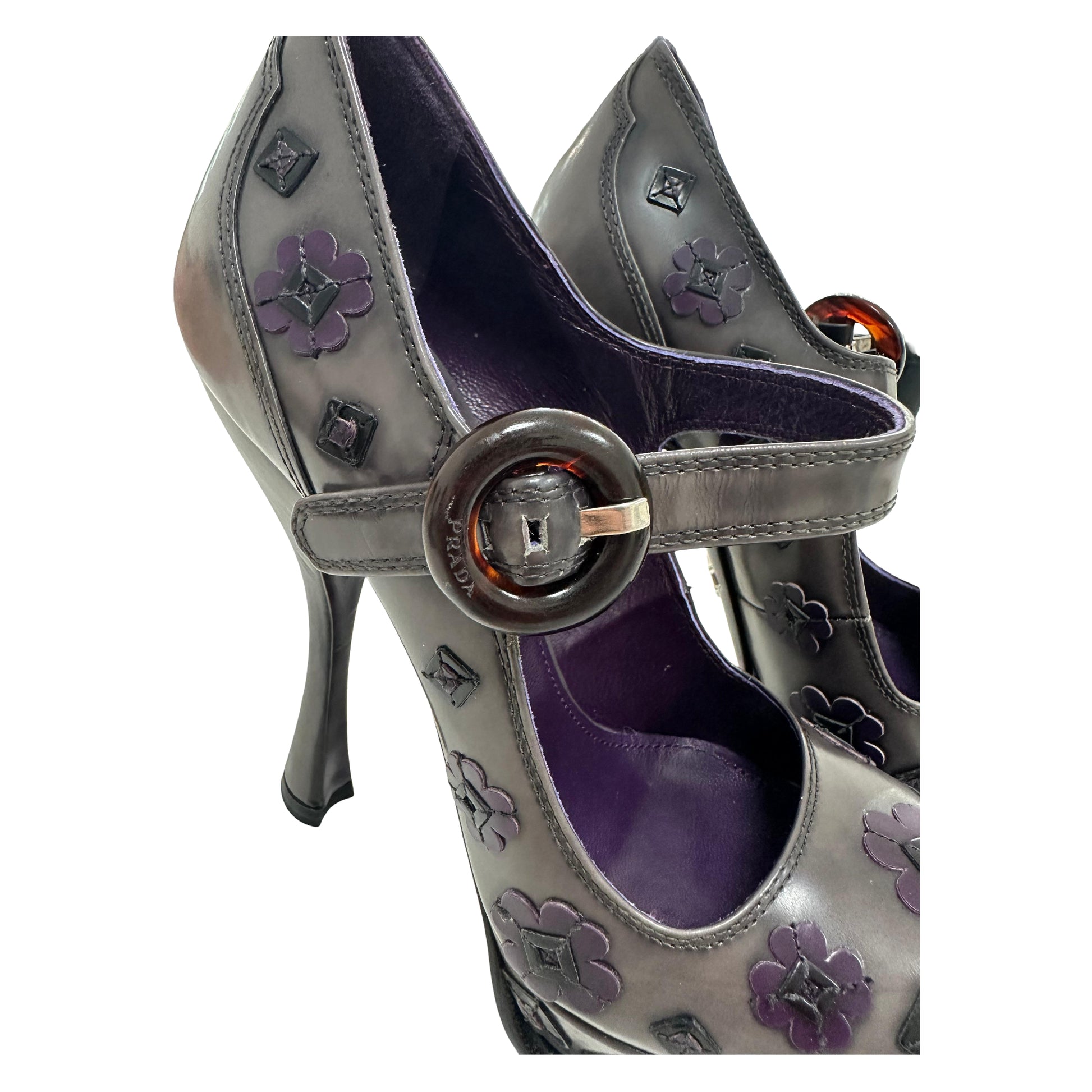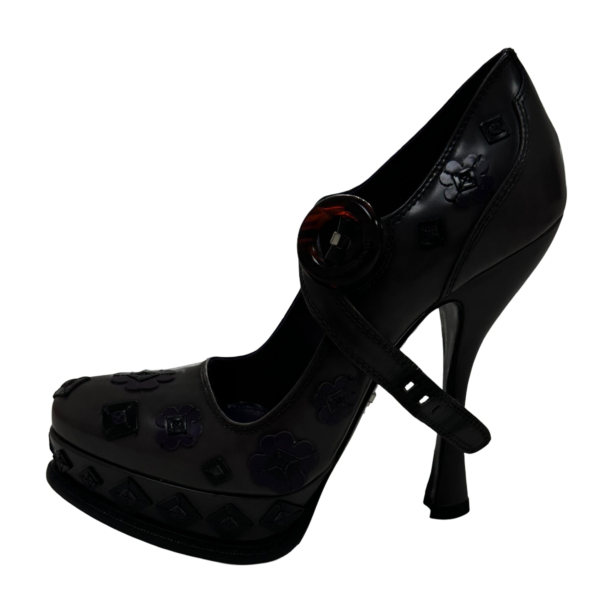 The Prada Mary Jane Spazzolato Flower Platform Pumps in Violet combine dramatic height, playful detailing, and classic Italian craftsmanship — a true statement piece for the fashion enthusiast.