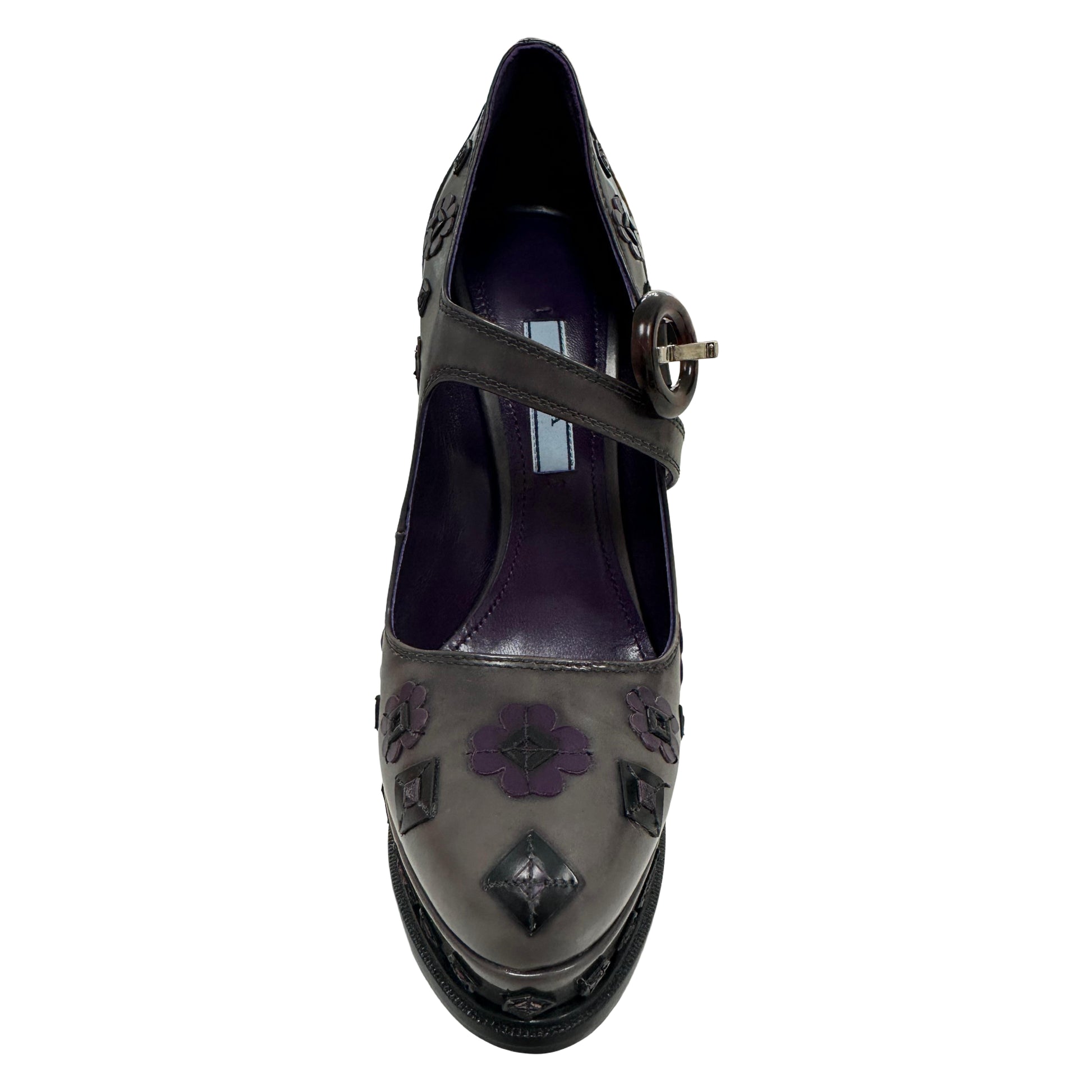 Prada Mary Jane Spazzolato Flower Platform Pumps Violet